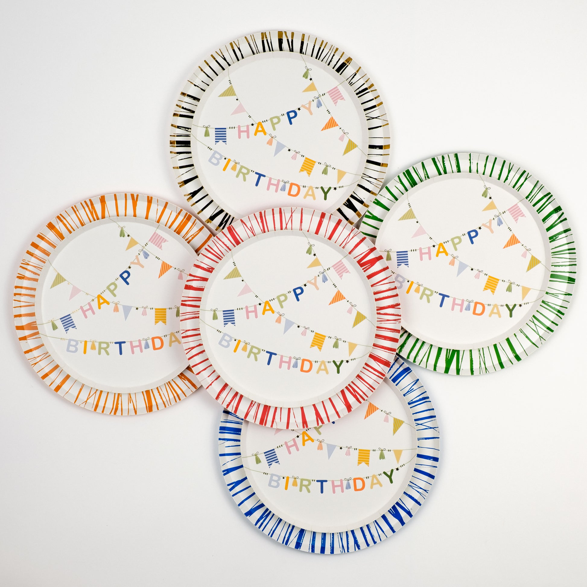 These delightful Birthday Cheer dessert plates feature a whimsical design of colorful bunting and tassels strung with the words "HAPPY BIRTHDAY" in cheerful, pastel tones. The playful mix of stripes, patterns, and soft colors adds a festive touch to any birthday celebration. Perfectly sized for serving desserts or small bites, these plates bring charm and joy to your party table. They coordinate beautifully with our colorful Color Block plates or Radiance plates, creating a cohesive and vibrant table setting. Their disposable design ensures easy cleanup, so you can focus on celebrating the special day.