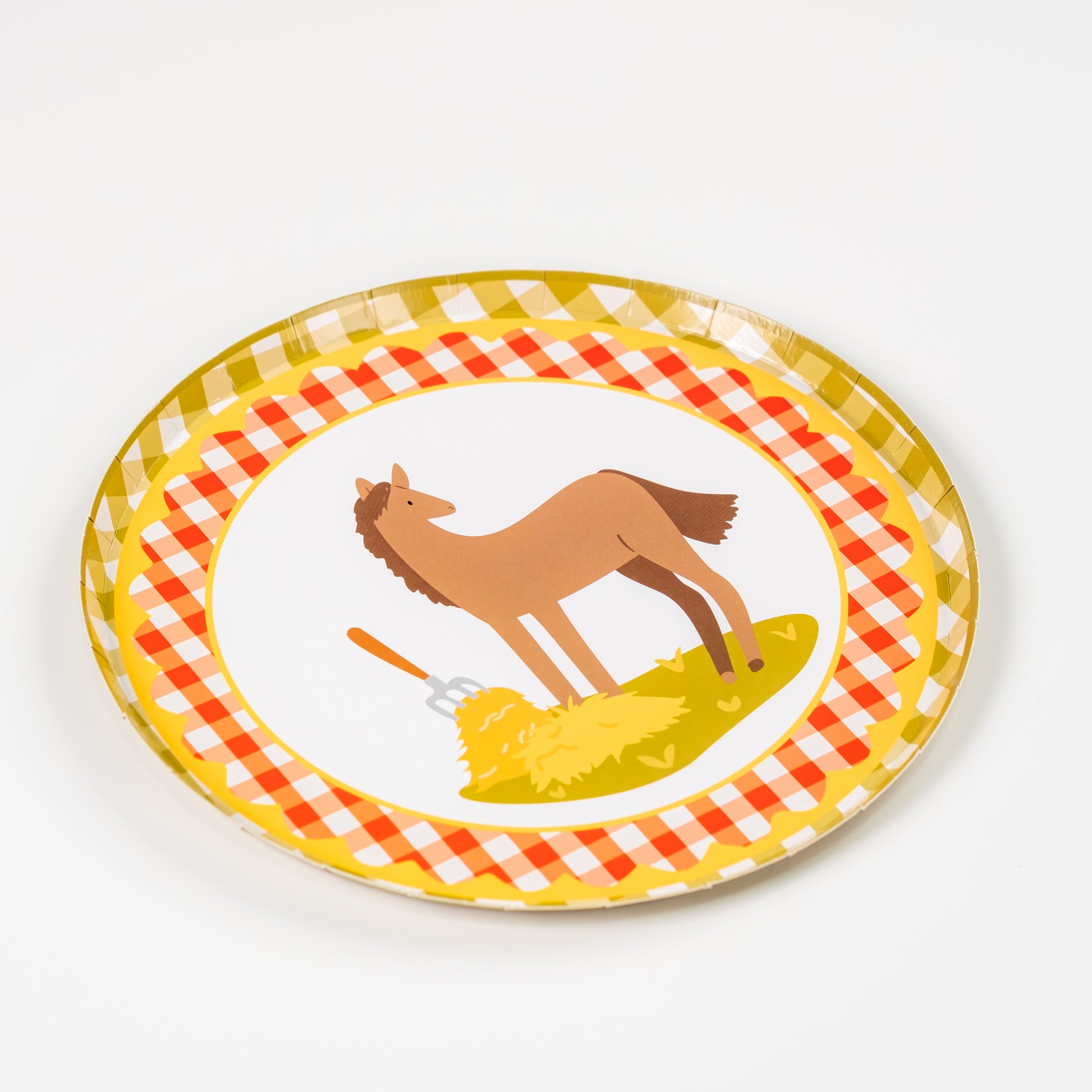 Add some country charm to your celebration with our Farm Animal Small Plates! This adorable assorted set includes four playful designs—featuring a cow, pig, horse, and rooster—each framed by a cheerful red, yellow, and green gingham border. These small plates are perfect for little hands and big sweet tooths, whether you're serving up birthday cake, cookies, or snacks at your barnyard bash.