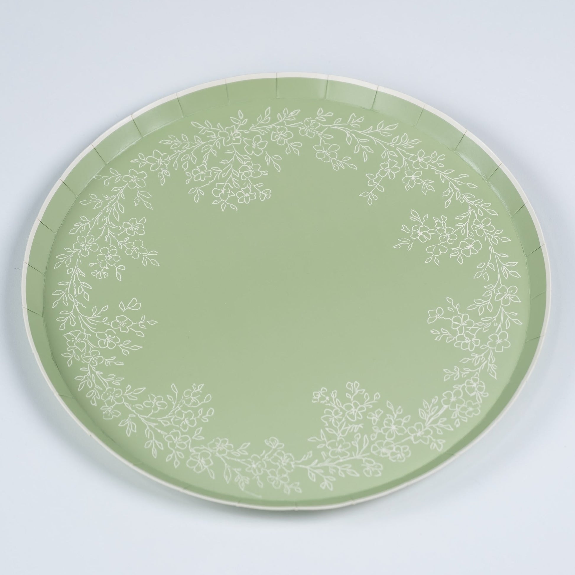 Set a timeless, romantic table with our Floral Elegance Dinner Plates. A softly scalloped rim frames a delicate botanical wreath, petite blossoms and leafy sprigs rendered in fine ivory linework. The art nods to vintage china, while airy negative space keeps the look fresh and modern. Available in blush pink, light blue, and sage, each pastel hue provides a gentle backdrop that lets the florals shine and coordinates seamlessly with the rest of the collection.