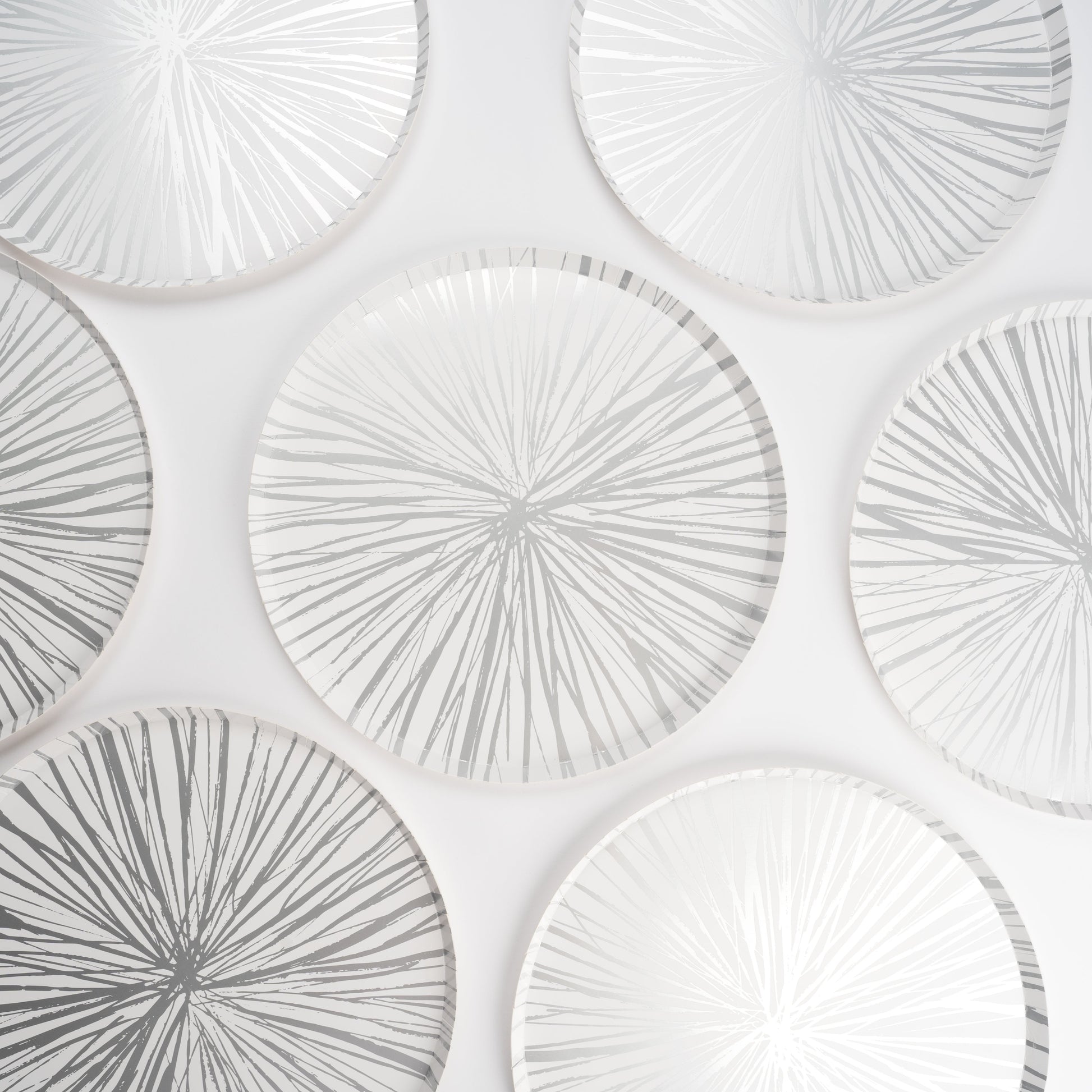 Elevate your dinner parties with Gatherings Radiance Silver Foil Dinner Plates! The silver foil sketchy lines add a touch of fancy and modern classic style to your tabletop. Impress your guests with these elegant plates that are sure to make a statement.