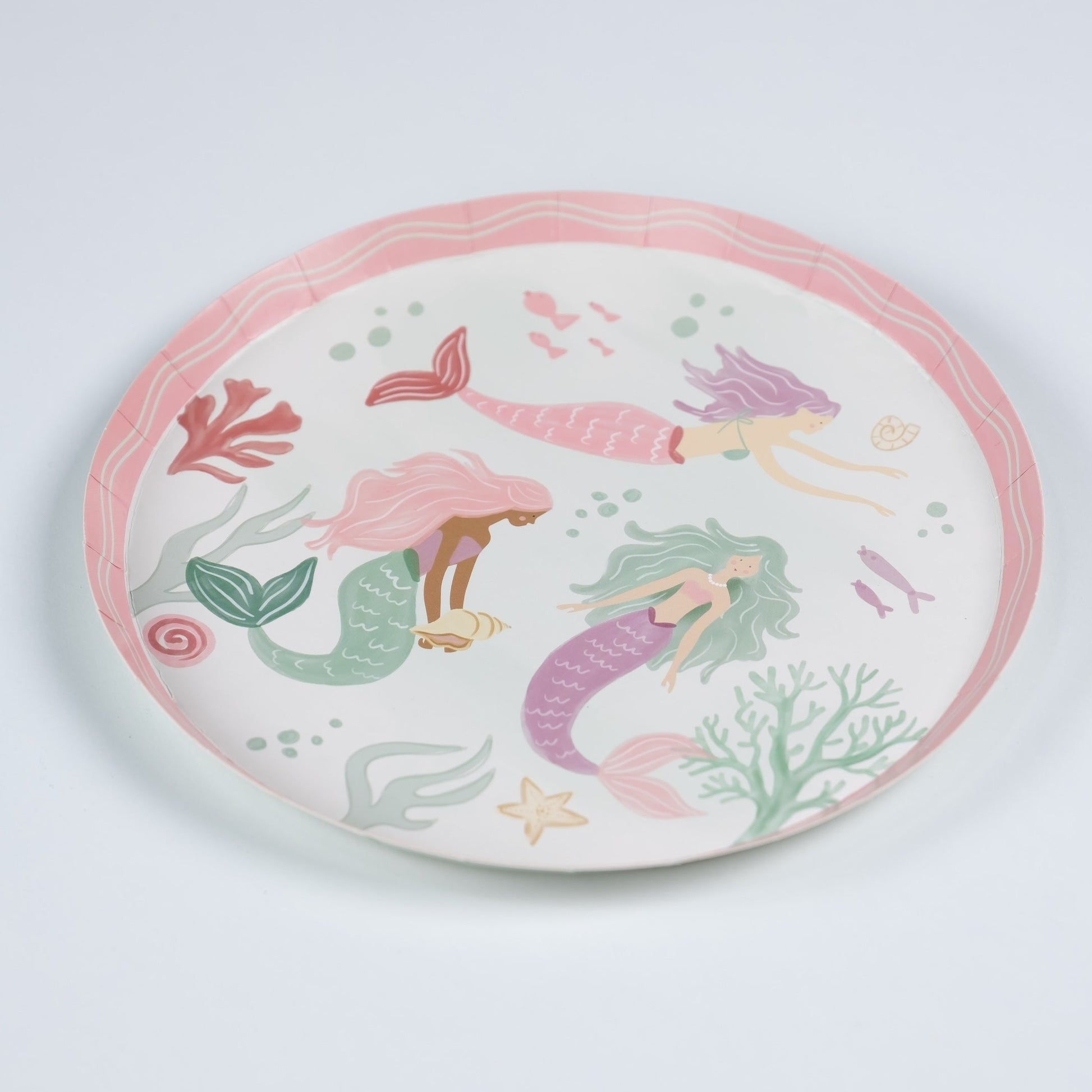 Make a splash with our Mermaids Small Plates! Featuring three dreamy mermaids swimming among coral, sea stars, and shells in soft shades of pink, mint, and lavender, these premium dessert/appetizer plates bring ocean-magic to every bite. Sturdy paper keeps cake, fruit, and snacks sailing smoothly while the wavy border adds whimsical, seaside charm.
