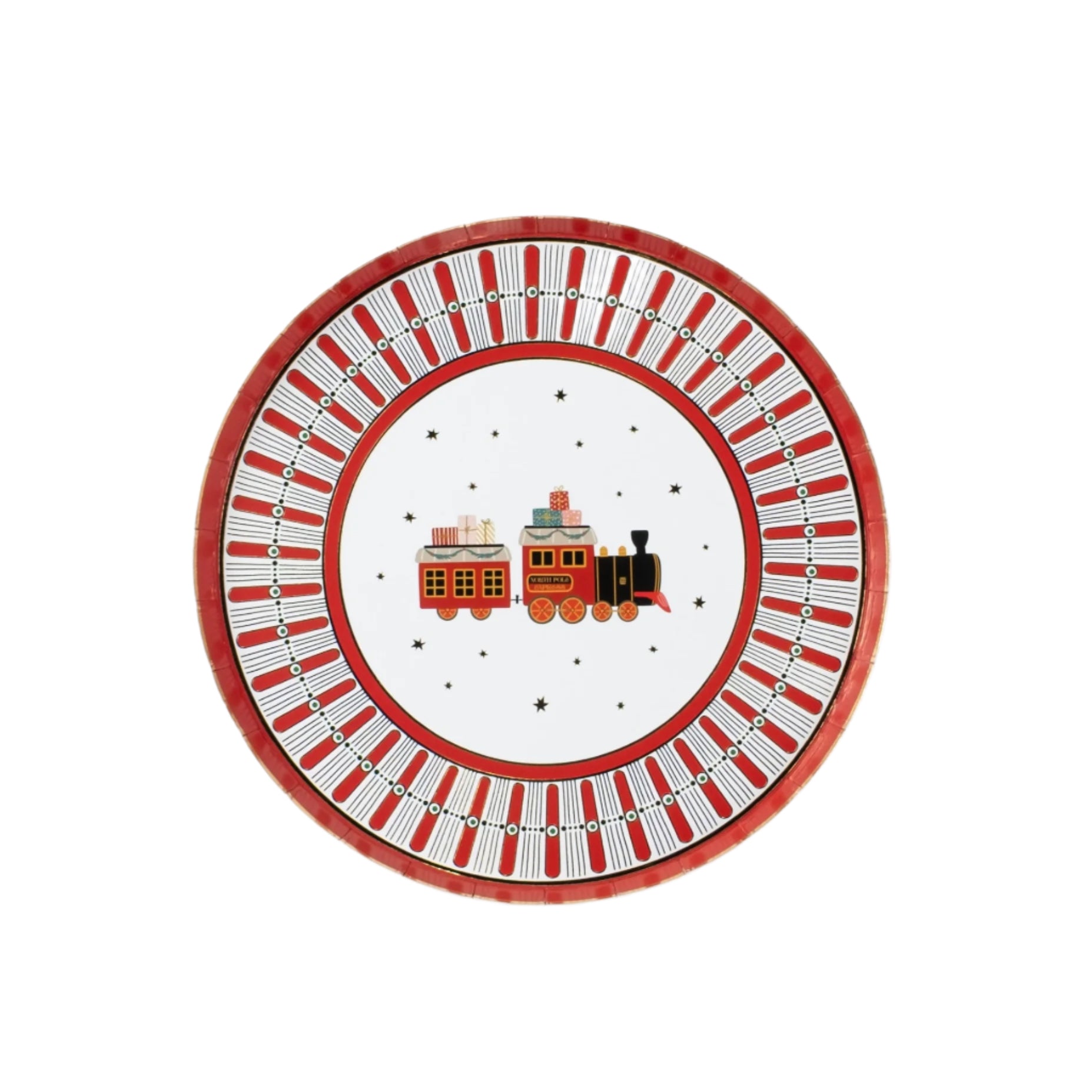 All aboard for holiday cheer! Our North Pole Express Dessert Plates feature a charming vintage-style Christmas train loaded with presents and holiday magic, surrounded by twinkling golden stars. The bold red border with intricate gold foil detailing adds a touch of classic elegance, making these plates perfect for cookie swaps, Christmas Eve desserts, holiday brunches, or Polar Express-themed parties.