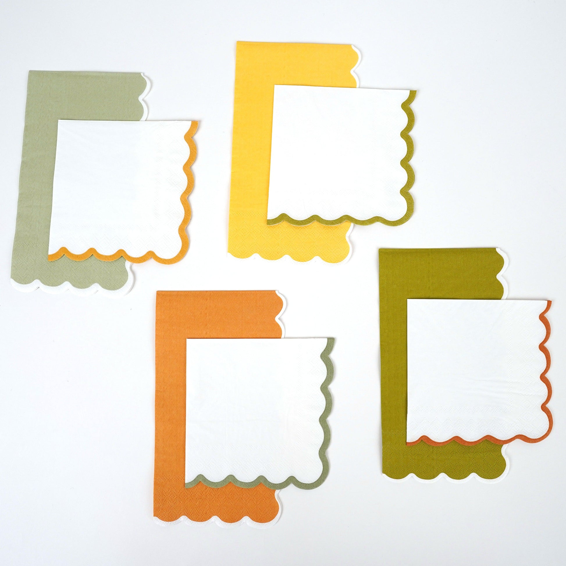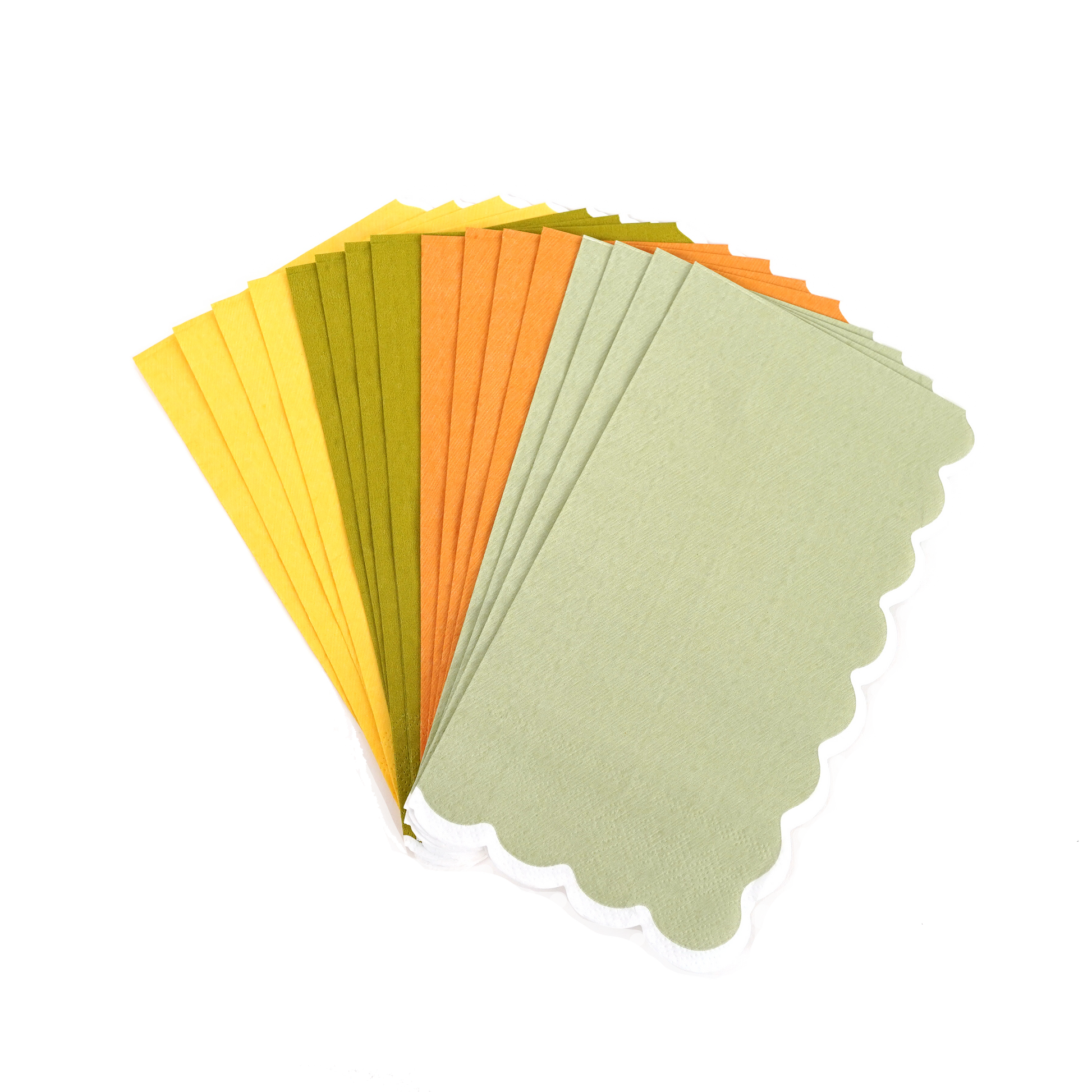 Elevate your next gathering with our beautiful scallop guest towel napkins. A harmonious mix of light green, orange, dark green and yellow, each one is sure to add a festive touch. Perfect for adding a vibrant burst of color to your tables-cape!