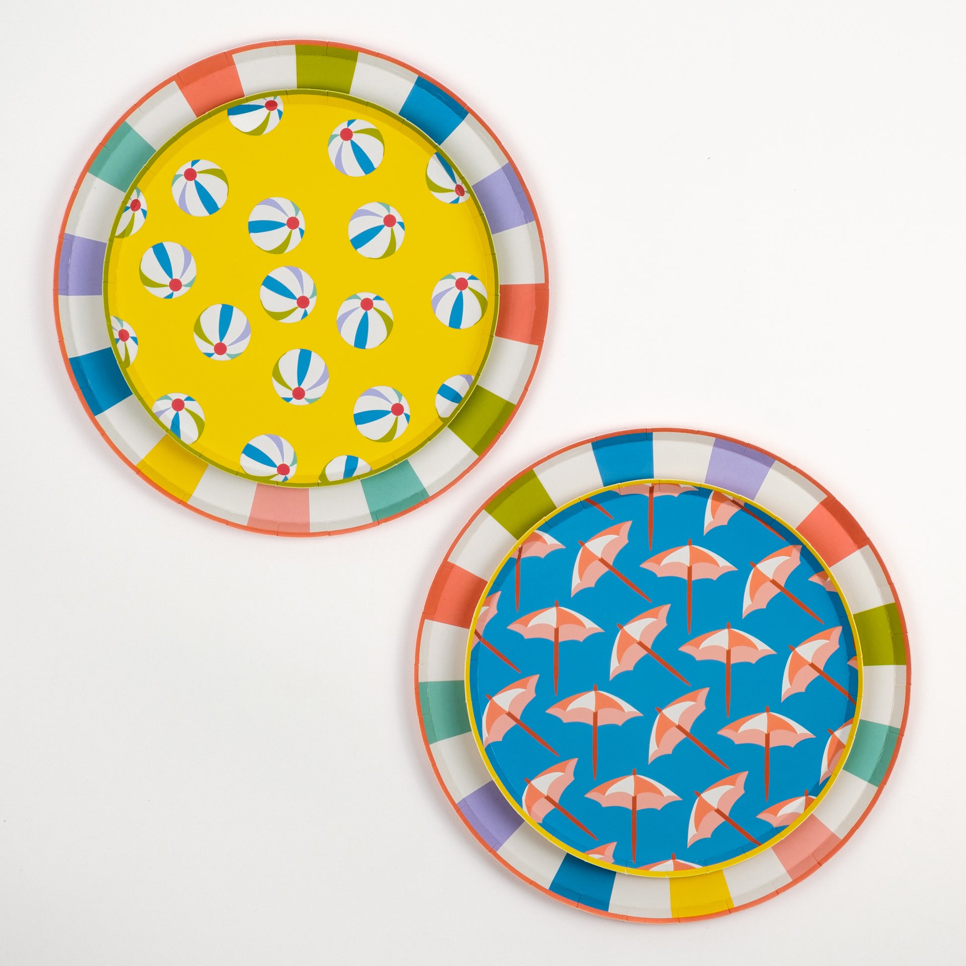 The dessert plates feature vibrant summer-themed designs that are playful and colorful. The blue plate showcases a repeating pattern of pink and white beach umbrellas, evoking a sunny day at the beach. The yellow plate is adorned with cheerful beach balls in shades of blue, green, and red, adding a fun and festive touch.