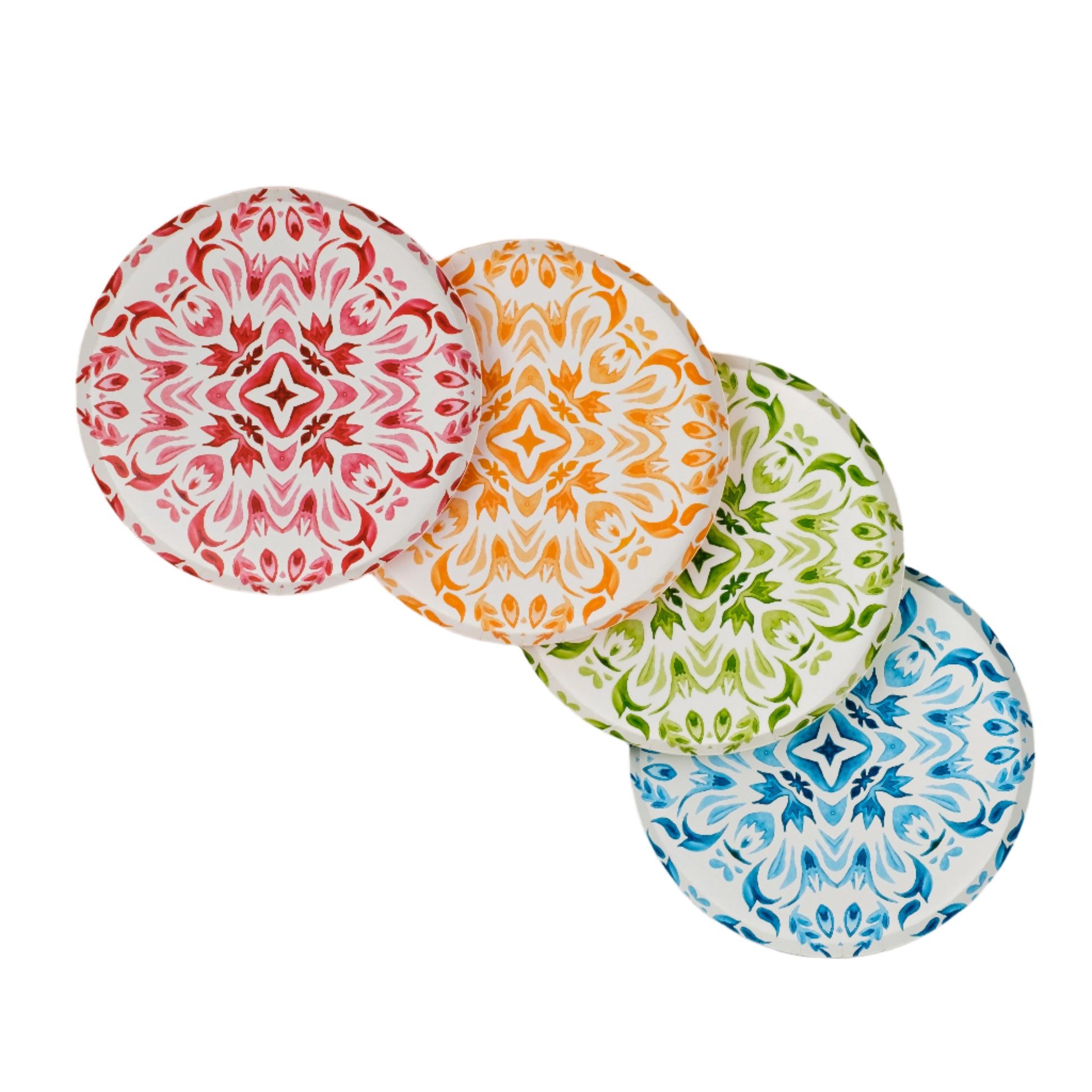 These Talavera-inspired dessert paper plates feature intricate floral patterns in vibrant shades of blue, green, orange, and red, reflecting the artistry of traditional Mexican ceramics. The delicate watercolor effect and symmetrical designs make these plates a standout for any occasion. The bold and colorful design adds a festive touch to any occasion, from Fiesta theme parties, summer gatherings to casual get-togethers. These plates are both stylish and practical for your entertaining needs. These disposable plates are both elegant and practical, making cleanup effortless while allowing you to enjoy your event without worry. Perfectly paired with our Talavera Beverage Napkins.